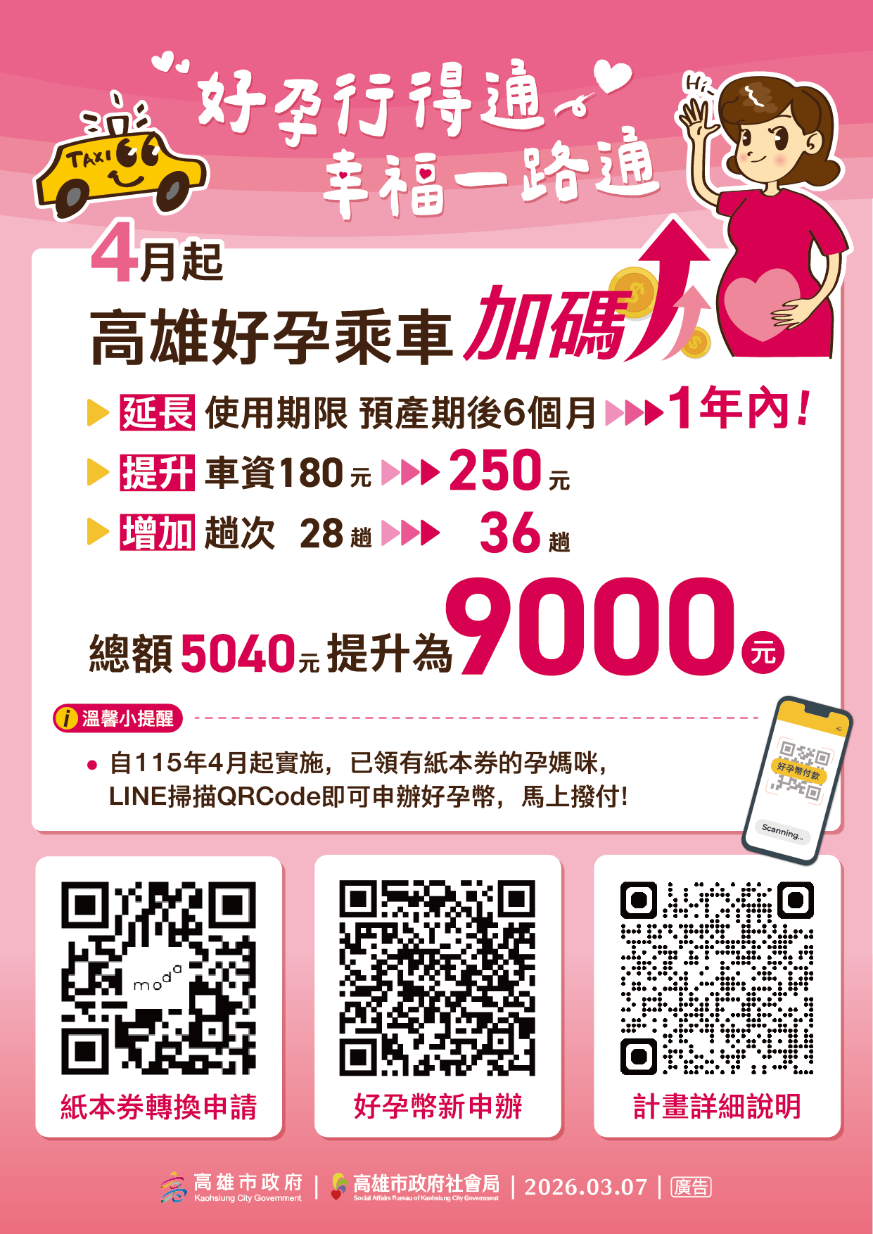 一、為提供孕媽咪貼心友善支持照顧措施,高雄市政府社會局辦理「好孕行得通」孕婦產檢交通補助,凡設籍本市之孕產婦,或與本市市民辦理結婚登記之非本國籍孕產婦皆可申請,自115年4月起補助趟次由原28趟次提升至36趟次,每趟最高折抵金額由180元提高至250元,補助總額由5,040元調升至9,000元,補助使用期限自預產期後6個月內,延長自核發日起至預產期後1年內,適用於產檢、產後回診及寶寶疫苗接種。